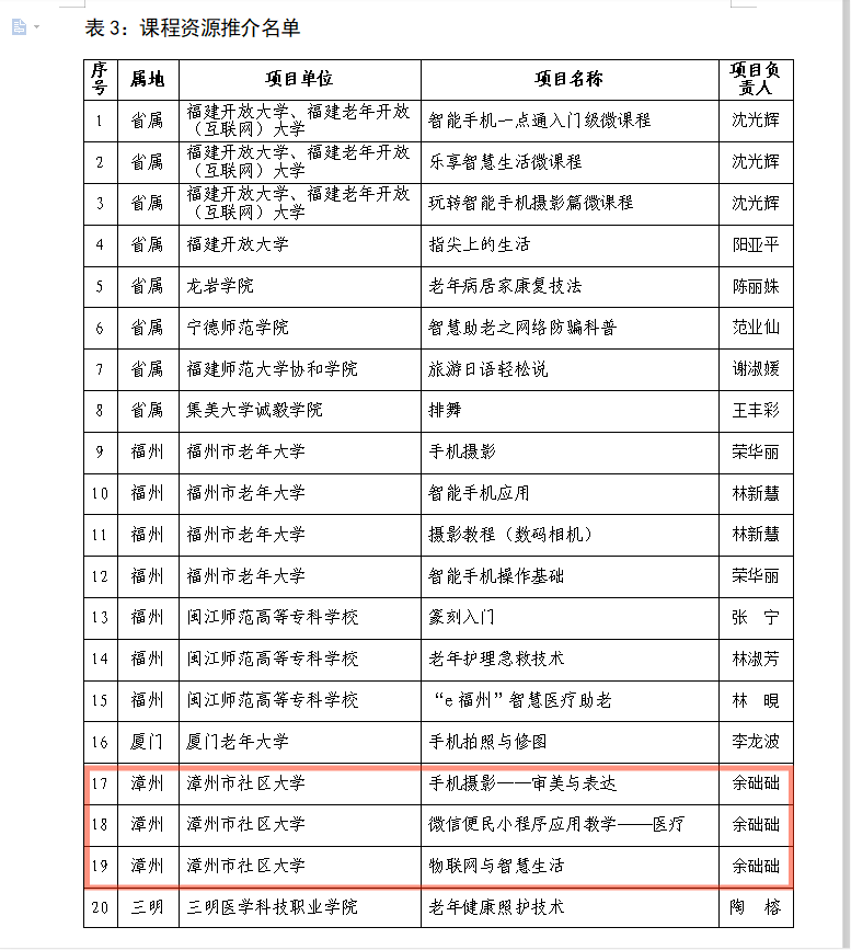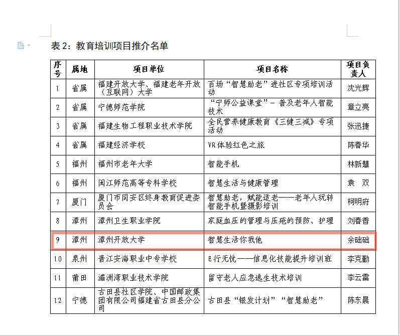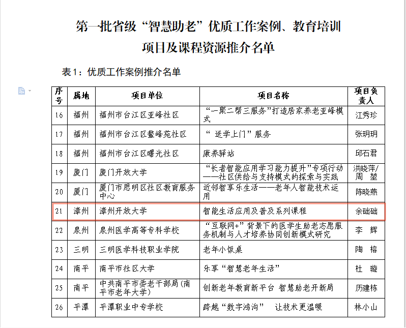 根据《福建省终身教育促进委员会关于组织开展省级“智慧助老”优质工作案例、教育培训项目及课程资源推介工作的通知》(闽终教委〔2021〕3号)要求,经省终身教育服务中心组织专家评议和福建省教育厅审核,漳州开放大学打造的“智能生活应用及普及” 系列课程入围第一批省级“智慧助老”优质工作案例,“智慧生活你我他”入围省级“智慧助老”教育培训项目,同时漳州开放大学打造的三门课程《手机摄影——审美与表达》《微信便民小程序应用教学——医疗》《物联网与智慧生活》入选省级“智慧助老”课程资源推介名单。据了解,本次共有26个优质工作案例、12个教育培训项目以及21门优质课程资源作为第一批省级“智慧助老”专题项目入选推介名单。
