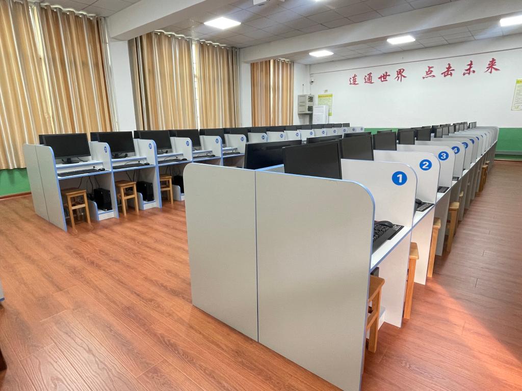 九、筹措资金35万元完成计算机机房改造。共添置电脑桌椅56套,购置联想台式电脑55台,铺设了金刚板、吊顶等。