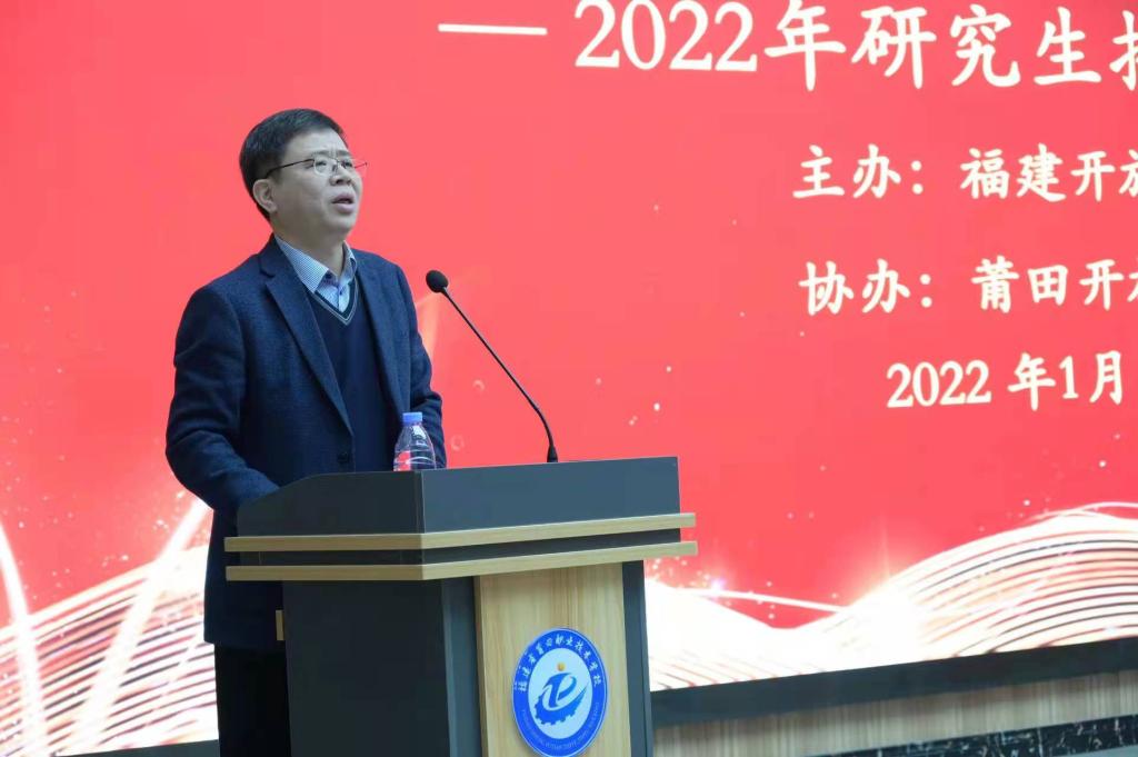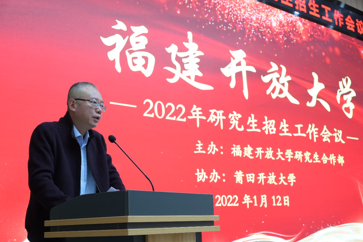 福建开放大学副校长李正光代表福建开放大学致辞,他总结了福建开放大学开展研究生教育整体工作情况,充分肯定了全省办学系统研究生招生工作取得的成绩,分析当前研究生教育工作中的不足,并部署了2022年研究生招生工作的主要任务。