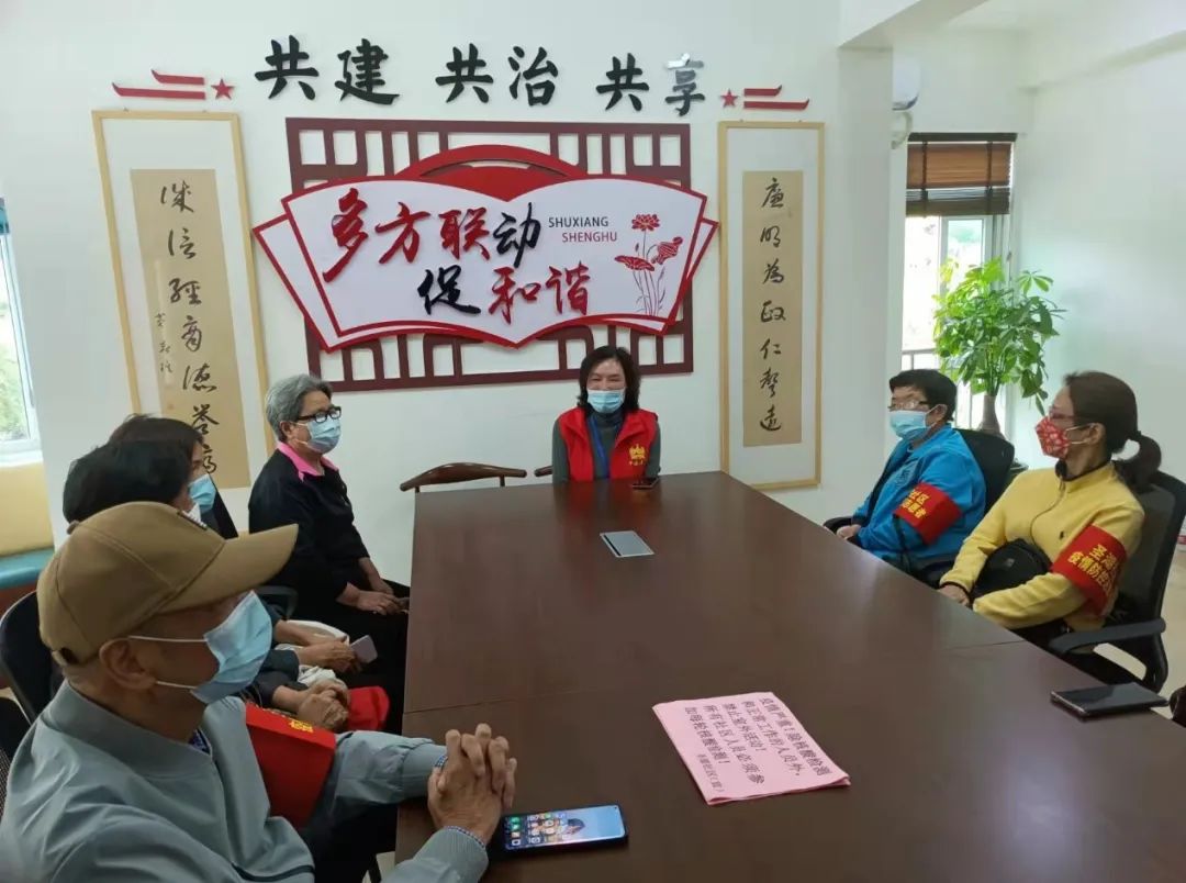 圣湖社区老年学校校长吴淑贤(中)主持召开“圣湖小区疫情防控劝导队”成立会议