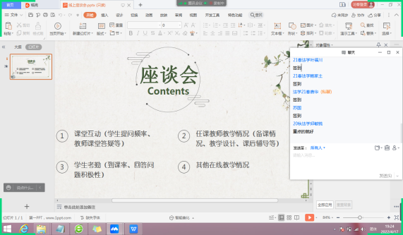 在云端课堂的舞台幕后,不仅有授课教师的辛勤汗水,而且也有着班主任和教务处管理人员的默默支持。疫情发生后,教务处管理人员迅速调整教学方案,进行直播平台操作使用培训,发布云端教学准备要求、进行听评课指标调整、进行直播教学安排通知、直播教学后台技术支持、进行直播教学督导和检查,服务精细到位。尤其在教学督导方面,教务处主任李红萍对各教研组长、班主任和教务处等云端督导组成员提出直播课堂听课督导要求,并亲自旁听参与课堂进行了为期一周的听课督导,在督导后及时提出督导意见,把好教学质量监控关。为了不断提高教学管理水平和教学质量,教务处要求班主任就本学期直播教学进行师生座谈会,收集学员对教师教风、学生学风、教学准备、教学平台使用等方面的意见建议,以便更好的改进,为学员提供更贴心的服务。22春法学本科班主任林惠敏老师提到4月15日召开的师生座谈会时说,座谈会开展比较成功,同学们积极发言,会议活跃氛围浓厚。同学们建议老师上课讲到理论知识的时候多引入案例,发一些相关学习资料。此外,同学们关心课本何时发放、课程安排,并咨询了考试相关事宜、奖学金、上课签到等事宜,同学们对学习充满期待,对学习生活充满热情。会后,第一时间将学生心声向教务管理人员和授课老师进行反馈,他们也及时处理和调整。班主任作为最接近学员的管理者,及时转发学习通知,做好教学意见反馈,进行课前课后教学答疑辅导,不厌其烦,真正成为学生学习的暖心服务者,教师教学的用心辅助者,教务管理的专业实践者。