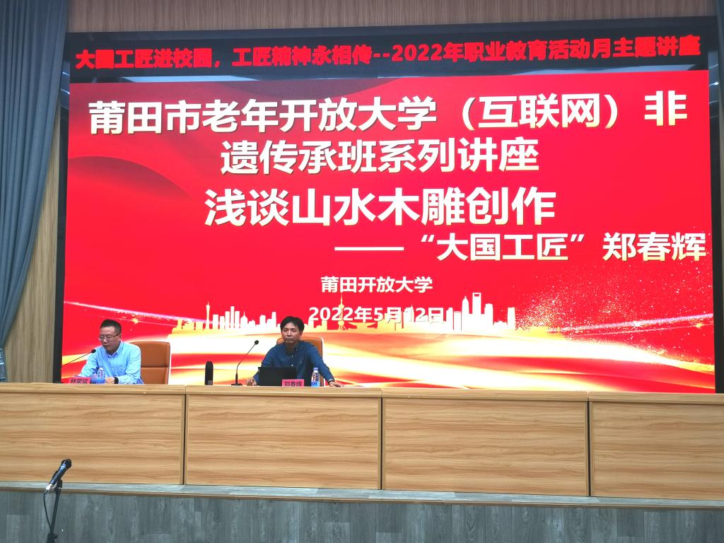 5月12日下午,2022年职业教育活动月主题活动——大国工匠郑春辉讲座在莆田职业技术学校举行。讲座由莆田开放大学党委书记林荣斌主持,木雕工艺大师郑春辉主讲,莆田开放大学和莆田职业技术学校近两百名老师现场聆听。作为职教宣传周内容之一,活动通过腾讯视频同步直播,全市职业学校师生在线观看。