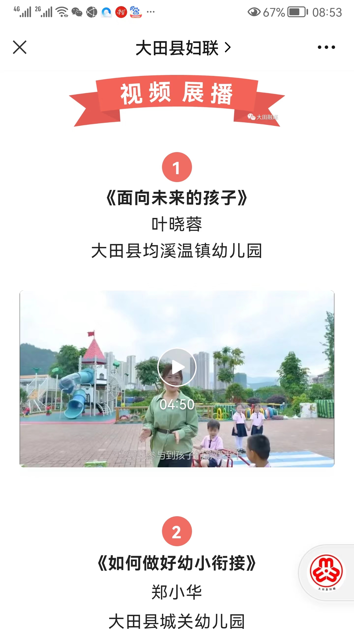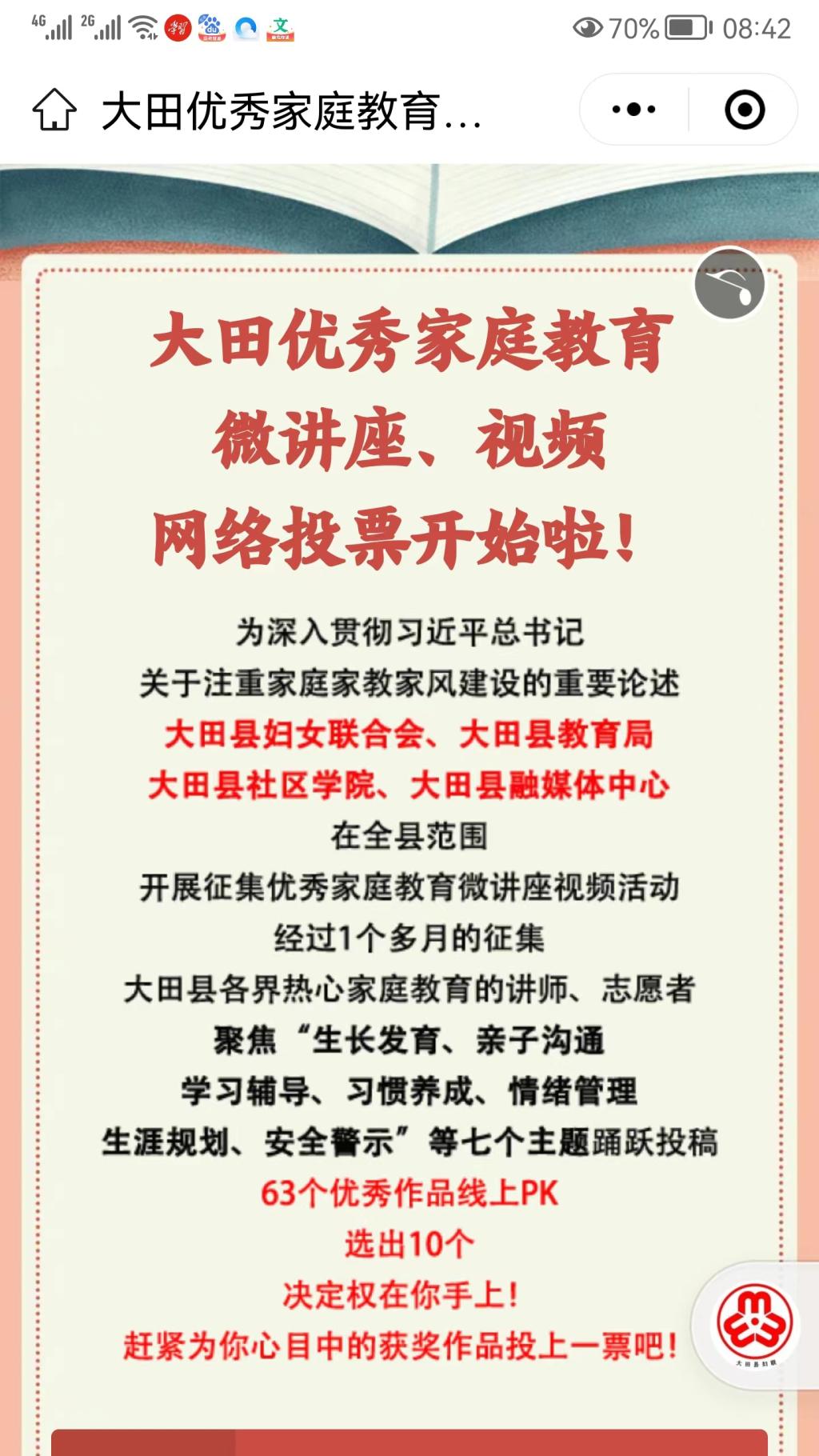 为扩大该项活动参与面和影响力,依托县融媒体公众号开展网络投票,并组织专家评审,共评出一等奖6个、二等奖12个、三等奖20个。同时,选取部分优秀作品在大田融媒、大田县妇联等微信平台进行展播,扩大宣传面,促进家庭教育优质资源的交流共享,深受广大家长的欢迎和好评。