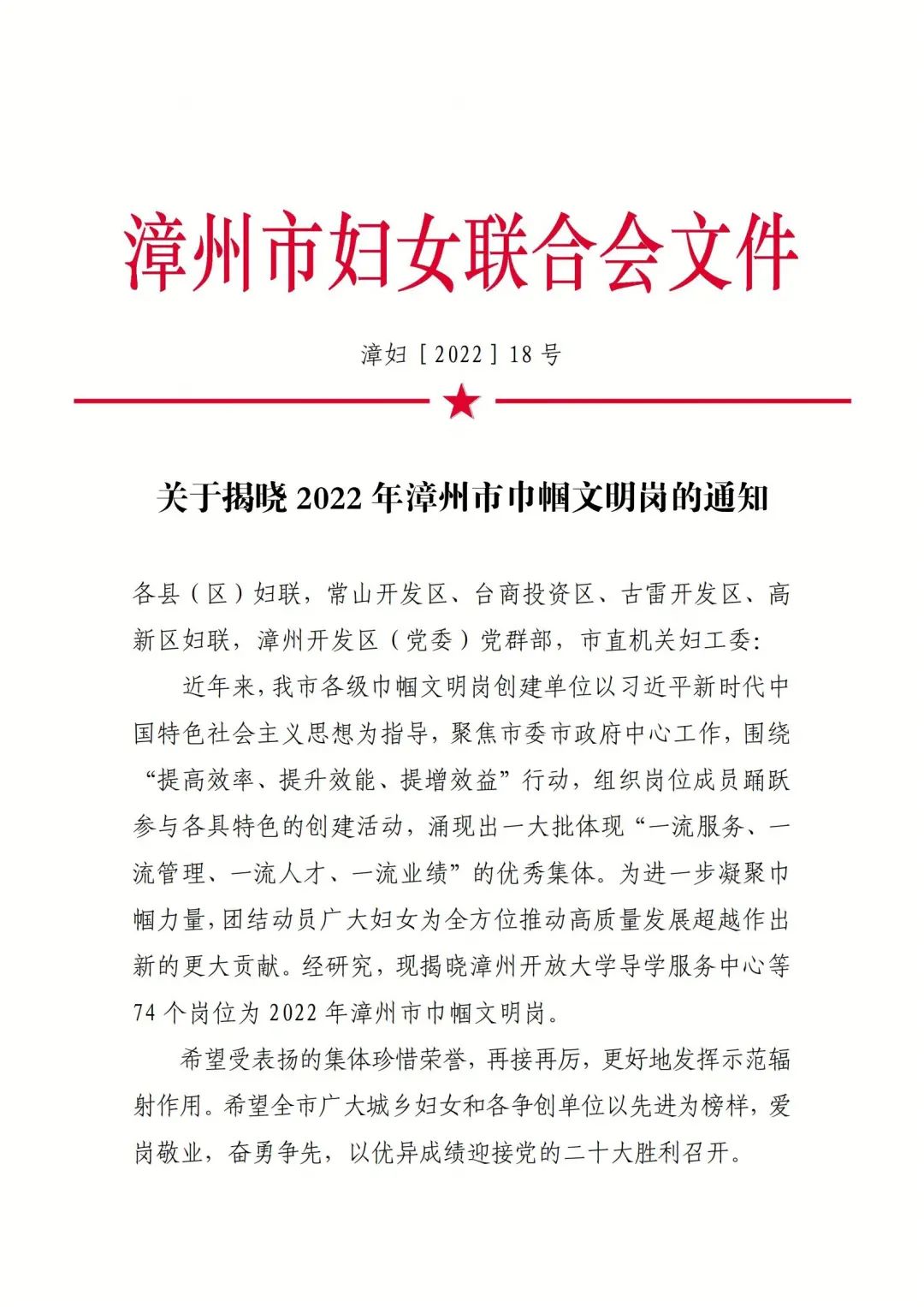 2022年8月22日,漳州市妇女联合会揭晓 2022 年“漳州市巾帼文明岗”名单,漳州开放大学导学服务中心获得2022年“漳州市巾帼文明岗”荣誉称号。