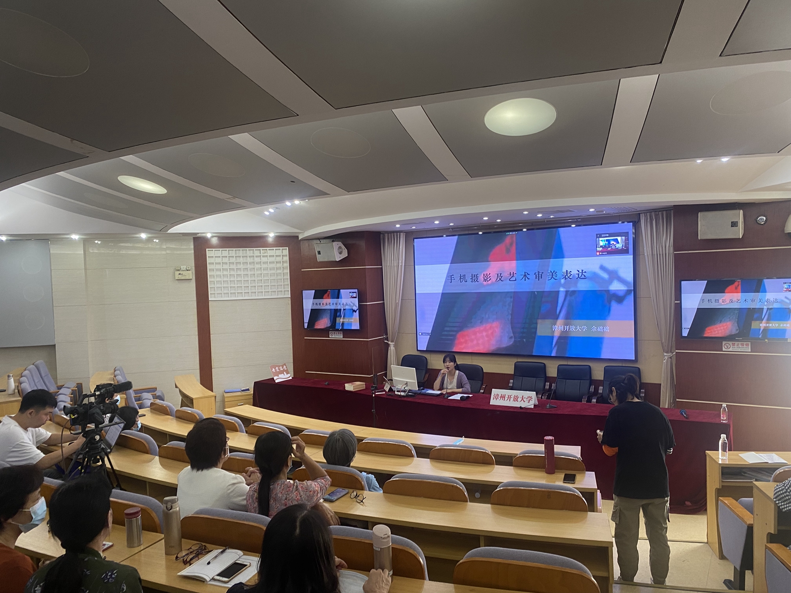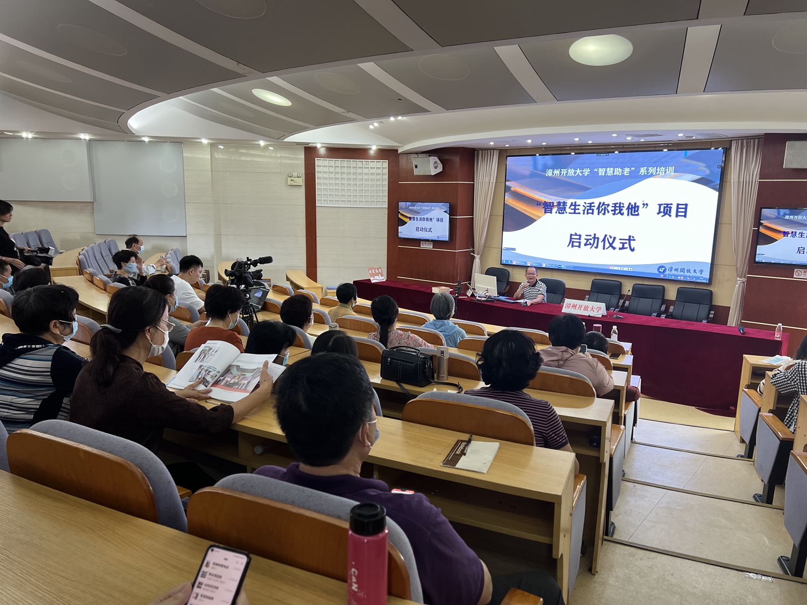 10月20日上午9点,漳州开放大学举行国家级“智慧助老”教育培训项目——“智慧生活你我他”活动启动仪式,同时开启项目的首场讲座《手机摄影及艺术审美表达》。活动采用“线上+线下”“校内+校外”的形式举办。副校长陈毅文出席启动仪式并致辞,部分教师及漳州市老年开放(互联网)大学全体学员参加了校内主会场活动,漳州市老年大学,龙文区铁路社区、龙兴社区,芗城区和平里社区、金源社区设立分会场,社区的老年朋友们通过“福建终身教育”观看了当天的直播。社区教育办主任余础础主持。