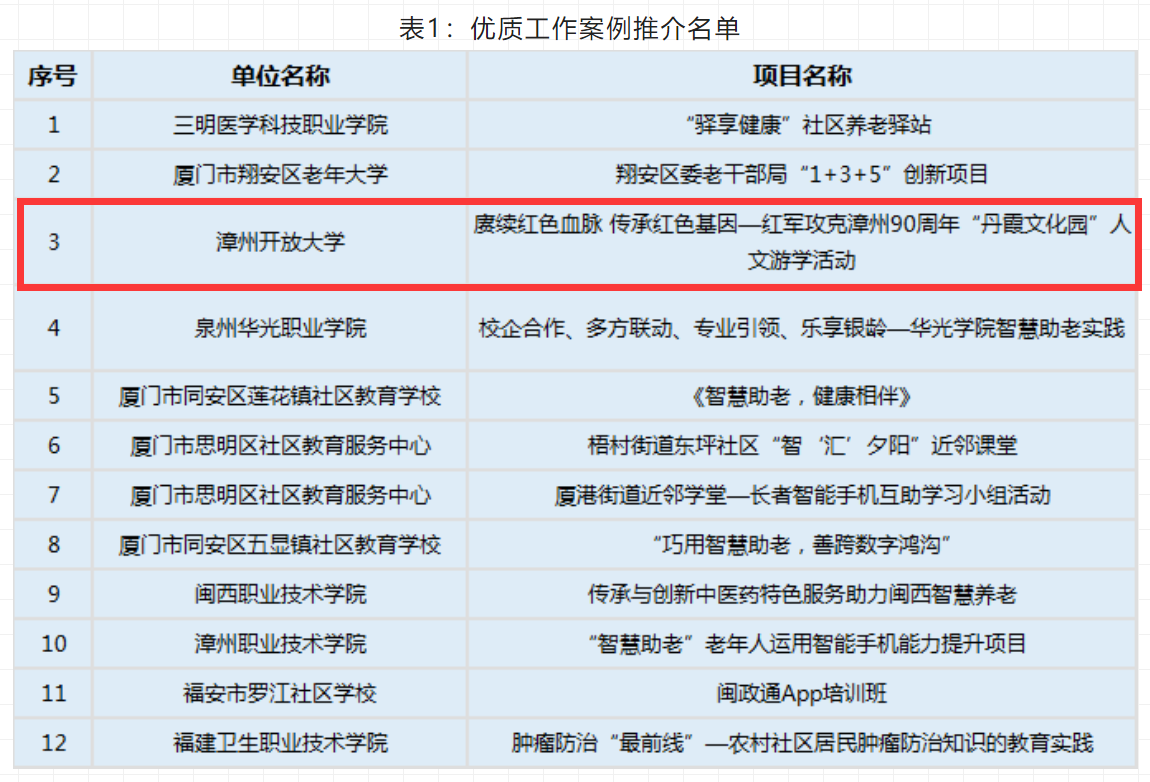 近日,福建省终身教育促进委员会发布《关于推介第三批省级“智慧助老”优质工作案例、教育培训项目及课程资源的通知》,漳州开放大学报送的《赓续红色血脉 传承红色基因——红军攻克漳州90周年“丹霞文化园”人文游学活动》入选优质工作案例推介名单、《霞漳正学、文脉绵延》入选课程资源推介名单。