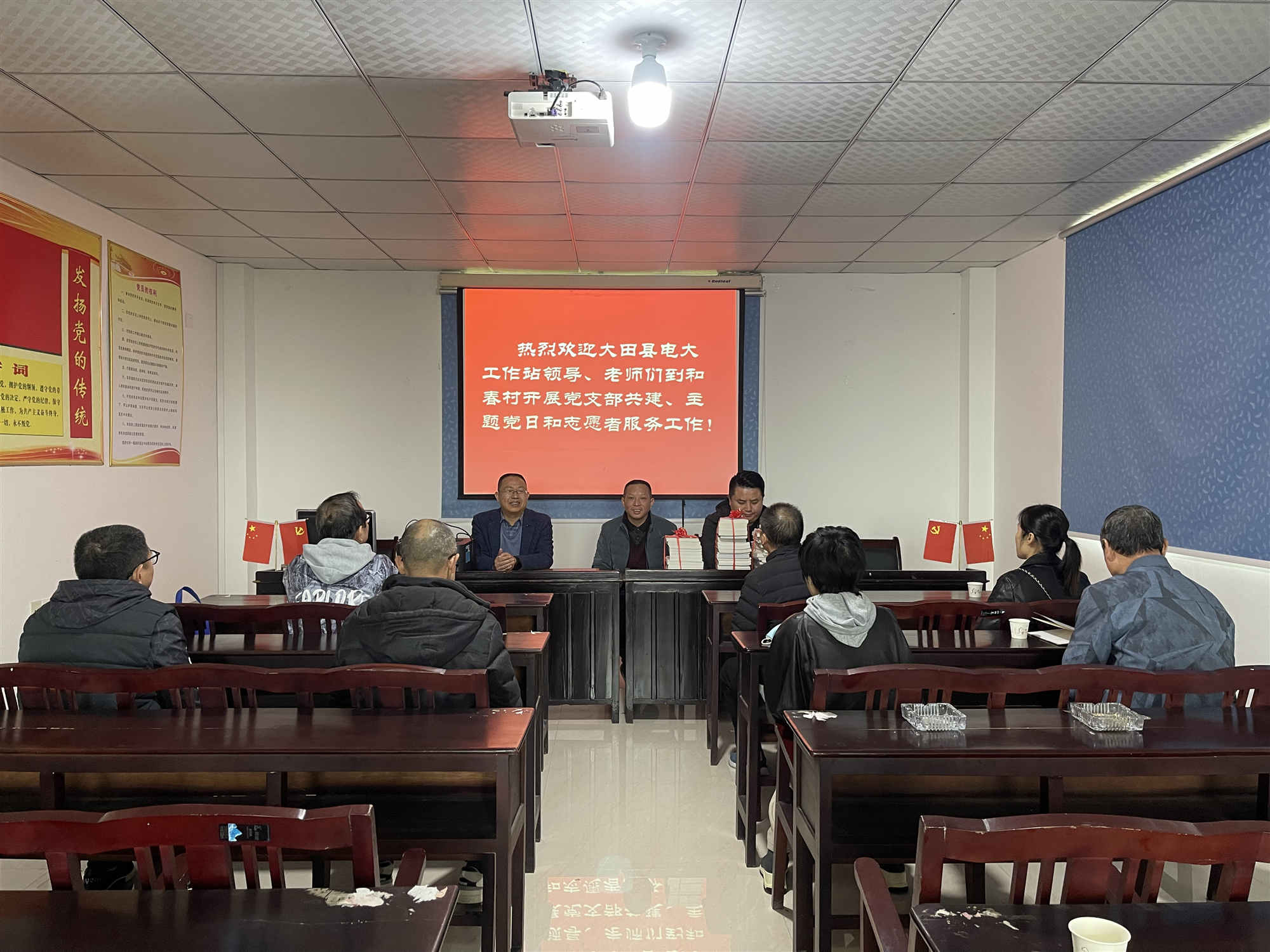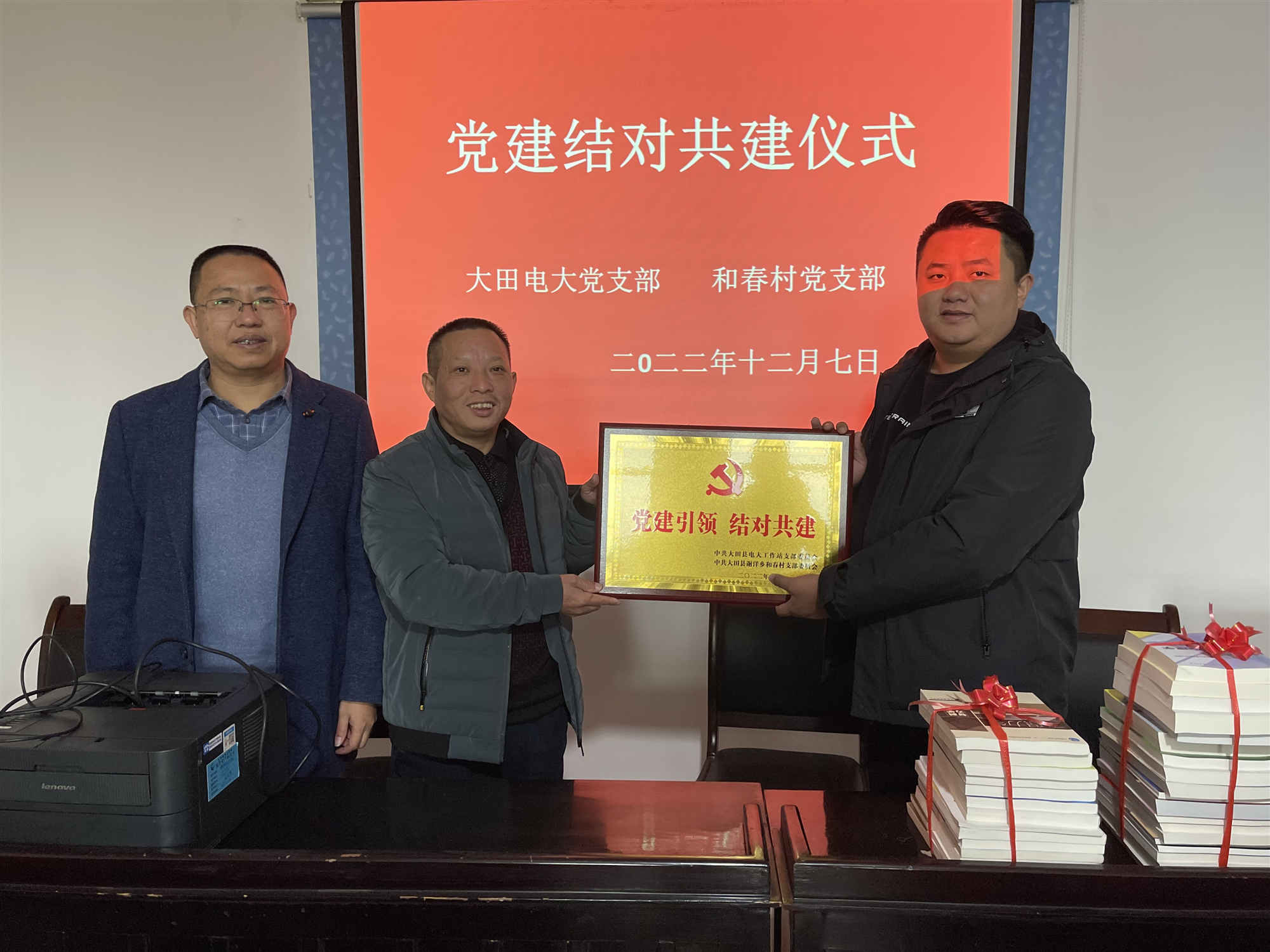 活动首先举行电大党支部与和春党支部结对共建仪式。为做好帮扶结对工作,大田电大为和春村赠送了一批会议桌椅、投影仪、办公电脑、打印机以及近500册的图书,进一步完善村级办公条件。和春村党支部书记林永庆为电大教师回赠了《和春村史》一书。随后,由驻和春第一党支部书记徐建清为大家宣讲党的二十大精神,并围绕“乡村振兴”主题进行学习研讨。