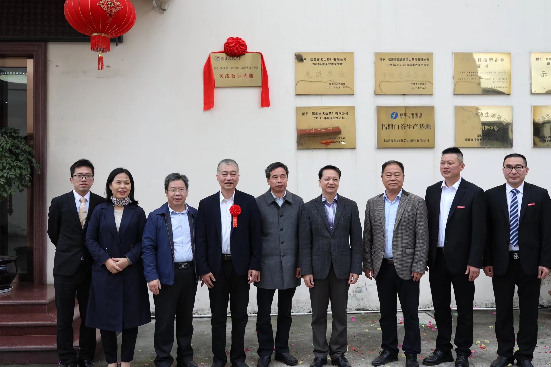 12月9日上午,福建开放大学茶艺与茶文化专业实践教学基地在福建省福鼎市名山茶叶有限公司揭牌成立。福建开放大学党委书记陈兴炎,宁德开放大学党委书记、校长叶祖庚,福建开放大学党政办主任吴国,福建开放大学文经学院党总支书记、院长王妙真,福鼎市教育局主任科员林孝密,福建省福鼎市名山茶叶有限公司董事长林飞应,福鼎开放大学党支部书记江孝松等出席揭牌仪式。