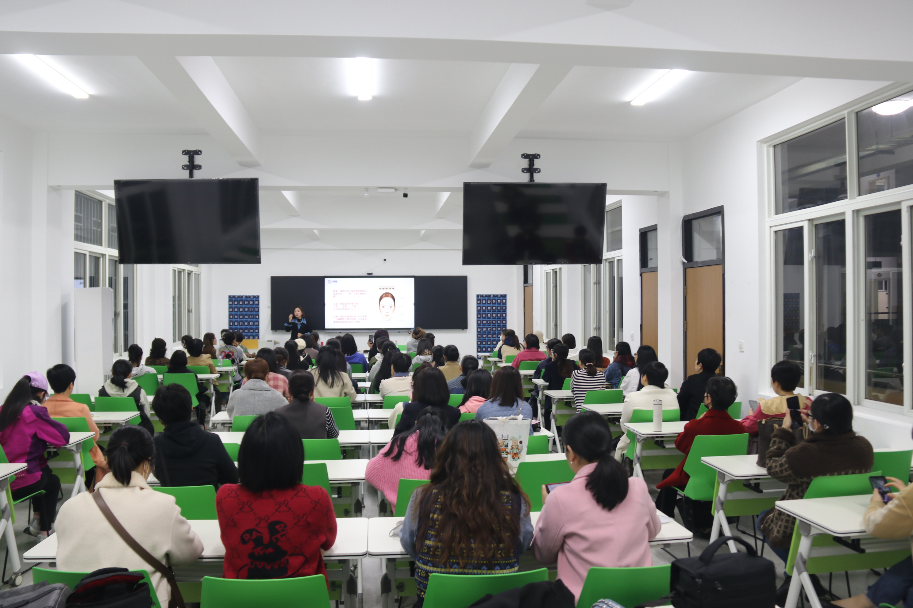本次讲座以帮助现代女性提升个人形象为宗旨,以女性日常护肤、化妆技巧等为主要内容,国家美容师二级技师、国家高级化妆师、国家高级美容师周玉明向大家详细讲解了日常护理皮肤的重要性,不同脸型适合的妆容,以及日常护肤步骤、常用工具、产品分类与挑选等。讲座还现场邀请了一位志愿者作为模特,为学员示范化妆的顺序、化妆工具的选择及脸部不同部位的化妆技巧等,通过实际操作加深对化妆技巧的掌握。讲座结束时,周玉明老师还针对大家提出的个性化问题给予耐心的解答以及建议。
