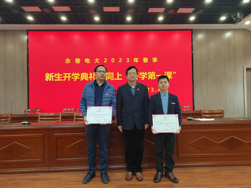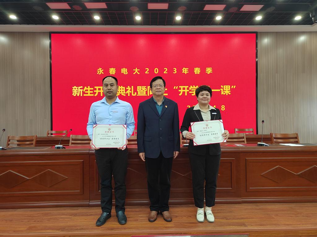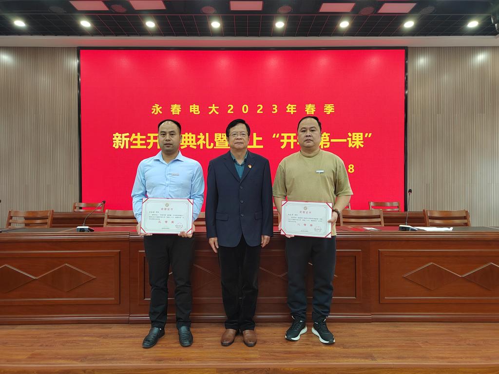 李锦江为2022年福建开放大学“喜迎二十大 强国由我”大学生网络文化作品获奖者林志军、吴应栋颁发荣誉证书