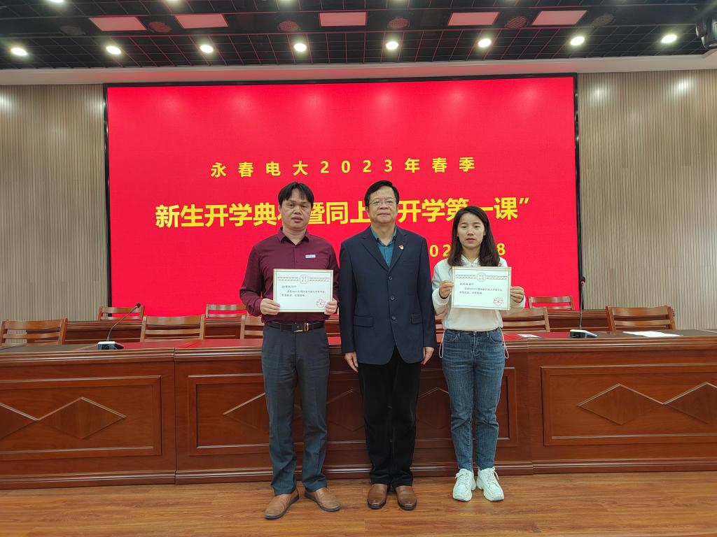 开学典礼上,李锦江为2021年度“国家开放大学优秀毕业生”获得者林志军,2021年度国家开放大学奖学金获得者刘伟政、王巧玲,2022年度福建开放大学“优秀毕业生”获得者吴应栋、郭素玉,2022年福建开放大学“喜迎二十大 强国由我”大学生网络文化作品二等奖获得者林志军、三等奖获得者吴应栋,2022年福建开放大学中华经典诵写讲大赛“笔墨中国”汉字书写比赛一等奖获得者黄更生、二等奖获得者康贵土颁发荣誉证书。