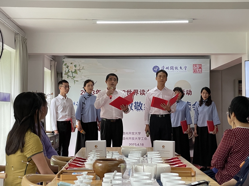 为迎接第28个“4·23世界读书日”的到来,深入贯彻习近平总书记关于文化自信的重要论述,形成全民爱读书、读好书、善读书的浓厚氛围,漳州开放大学举办了系列活动,4月18日下午,“读书品茗·致敬经典”朗诵会在学校行知图书馆举行,活动由漳州开放大学主办,丹霞读书会、漳州开放大学工会承办,学校党委书记、校长李然,丹霞读书会成员、漳州开放大学部分师生代表参加。