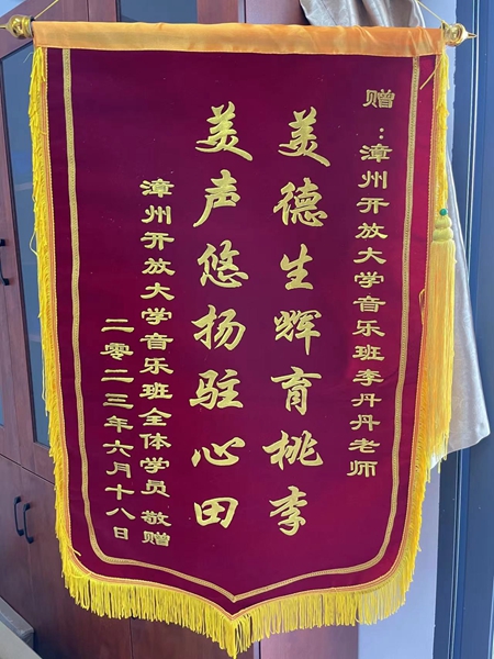 6月27日下午,漳州开放大学老年教育学员将“尊老为德 敬老为善 爱老为美 助老为乐”“才德双馨传技艺 飞扬鼓点赞师恩”“美德生辉育桃李 美声悠扬驻心田”“德才芳馨传技艺 欢悦课堂助老乐”的锦旗送到漳州开放大学社区教育办及任课教师手中,同时还为学校带来了精心排练的期末教学成果展示。锦旗虽轻,情意却重,这既是学员们对学校和教师所表达的诚挚感谢,也是漳州开放大学将“乐学养老”的积极老年观融入老年教育工作中的良好折射。