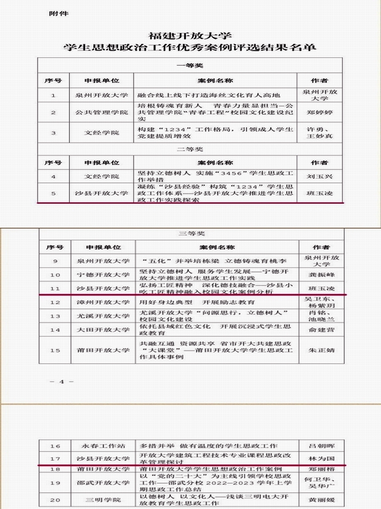 沙县开放大学选送的《凝练“沙县经验”构筑“1234”学生思政工作体系——沙县开放大学推进学生思政工作实践探索》获得二等奖、《弘扬工匠精神 深化德技融合—沙县小吃工匠精神融入校园文化案例分析》《开放大学建筑工程技术专业课程思政改革管理探讨》获得三等奖