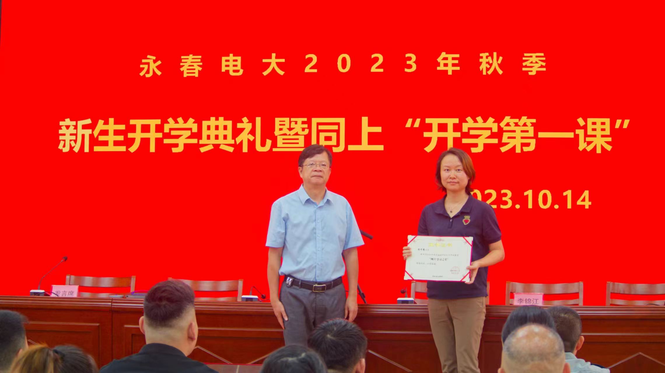 开学典礼上,李锦江分别为2021年福建开放大学学前教育专业学生幼儿教师技能大赛幼儿园玩教具制作项目一等奖获得者郑碧霞、2021年秋季福建开放大学开放教育“网上学习之星”获得者陈巧慧颁发荣誉证书,为2022年福建开放大学乡村振兴优秀创新与创业案例大赛三等奖获奖者吴应栋,林志军颁发荣誉证书和奖杯。