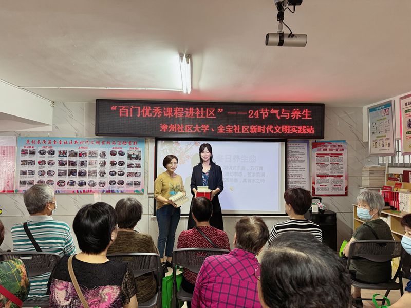 情暖重阳,爱在社区。在重阳节即将来临之际,为了大力弘扬中华民族尊老敬老的传统美德,进一步倡导敬老、爱老、助老的新风尚,10月19日上午,漳州开放大学“百门优秀课程进社区”来到金宝社区为老年居民们带来一堂精彩纷呈的公益讲座《二十四节气与养生》,主讲人漳州开放大学工会副主席林清清副教授。