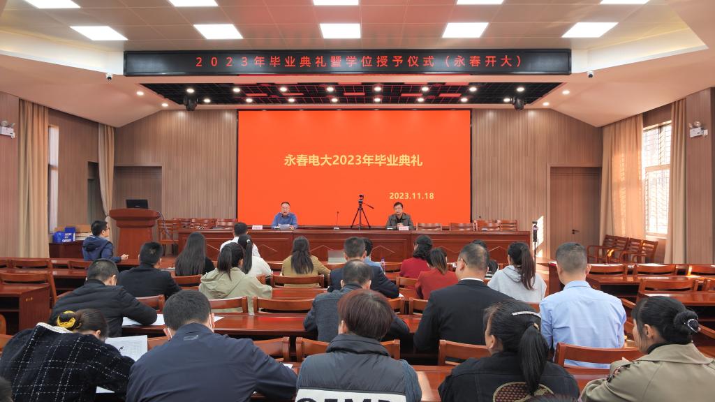 11月18日下午,福建开放大学举办2023年毕业典礼,福建开放大学永春学院在永春县教育中心六楼会议室设立分会场收看直播,并在分会场举办永春学院2023年毕业典礼。永春县教育局三级调研员李锦江出席活动,2023年毕业生代表和学院全体教职工参加。