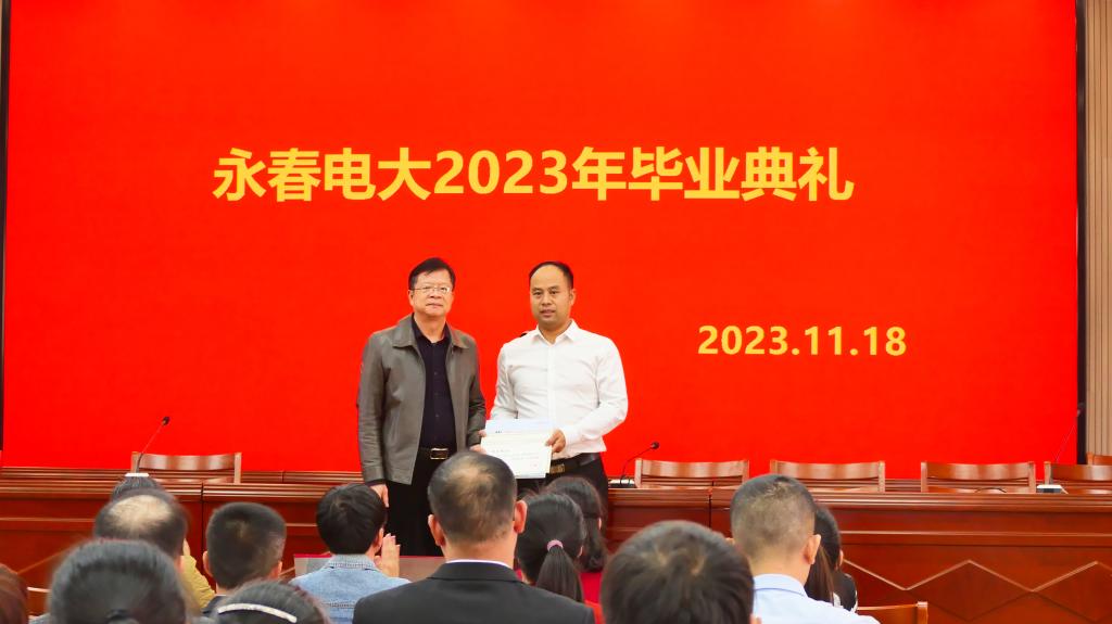 毕业典礼上,李锦江分别为永春学院2022年度国家开放大学优秀毕业生获得者吴应栋、10位永春学院2022-2023年度优秀毕业生代表颁发荣誉证书。