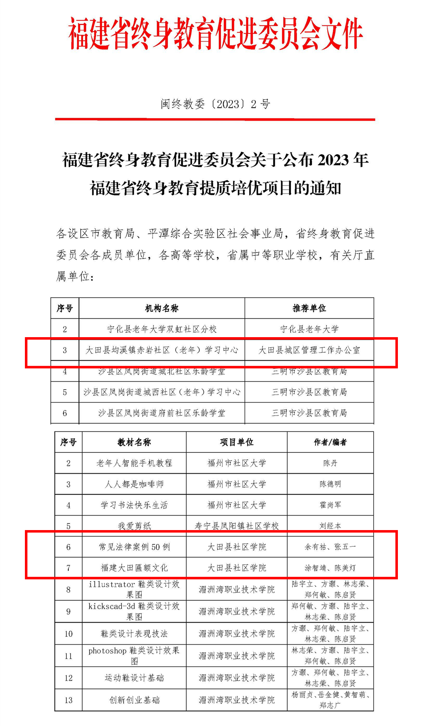 根据《福建省终身教育促进委员会关于开展福建省终身教育提质培优项目建设工作(2022-2025年)的通知》精神,经申报推荐、专家评审、网络公示,大田县三个项目上榜,获2023年省级终身教育提质培优项目。