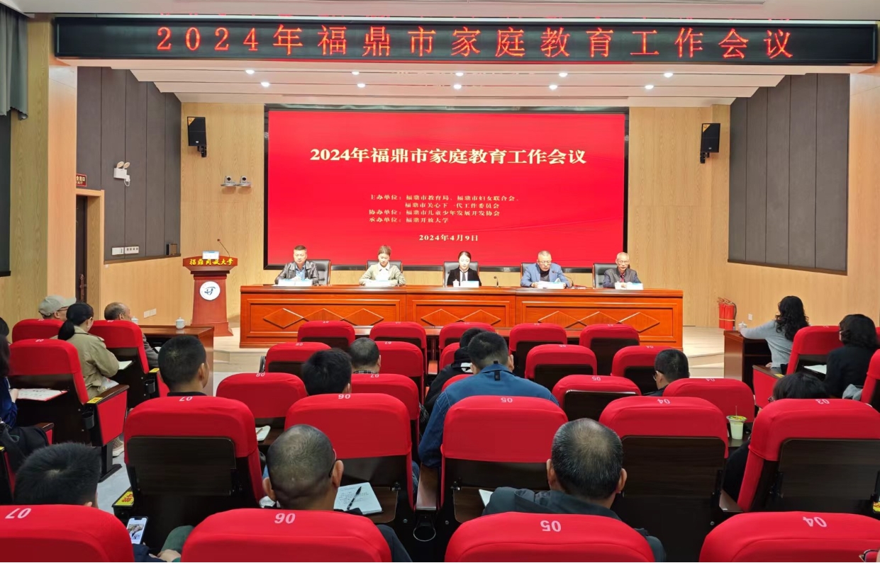 4月9日上午,为深入贯彻落实习近平总书记关于家庭家教家风建设的重要论述,全面提高福鼎市市家庭教育水平,推动全市家庭教育工作深入开展,努力构建家校社协同育人机制,福鼎市2024年家庭教育工作会议在福鼎开放大学召开。福鼎市妇联主席林黎思、市人民政府教育督导室副主任陈文翰、市妇联副主席陈东、市关工委副主任温兴奋,全市各中小学、幼儿园分管德育副校(园)长,市级家庭教育指导专家、部分校级优秀家庭教育指导师,及市儿童少年发展开发协会、市教育系统关工委和福鼎开放大学相关人员等,共130多人参加会议。会议由福鼎开放大学党支部书记江孝松主持。