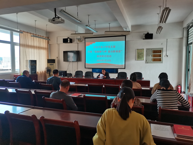 4月10日下午,为深入学习贯彻习近平文化思想,深化拓展省委“深学争优、敢为争先、实干争效”行动,深入开展三明市“红色领航、生态领向、产业领跑、改革领先,促革命老区高质量发展”工作,推动永安市“爱永安、拼发展、敢担当、赢未来”专项行动,推动党员干部担当作为、建功立业,永安开放大学党支部组织全体党员开展“提振精气神 建功新福建”座谈研讨活动。