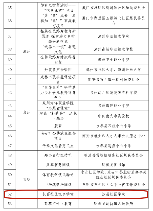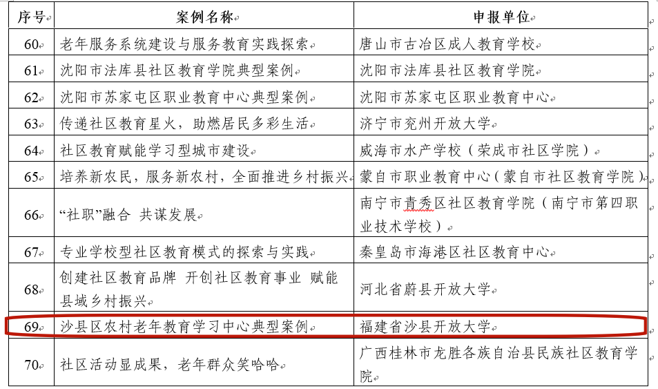 根据 《教育部关于印发 〈学习型社会建设重点任务〉的通知》加强学习型社区建设的有关要求,经各省级教育行政部门推荐、专家综合把关、网站公示等环节,100 项县域社区学习中心典型案例、300 门社区教育品牌课程名单予以推介公布。沙县开放大学推荐的《沙县区农村老年教育学习中心典型案例》、《非物质文化遗产沙县小吃系列课程》入选推介名单。