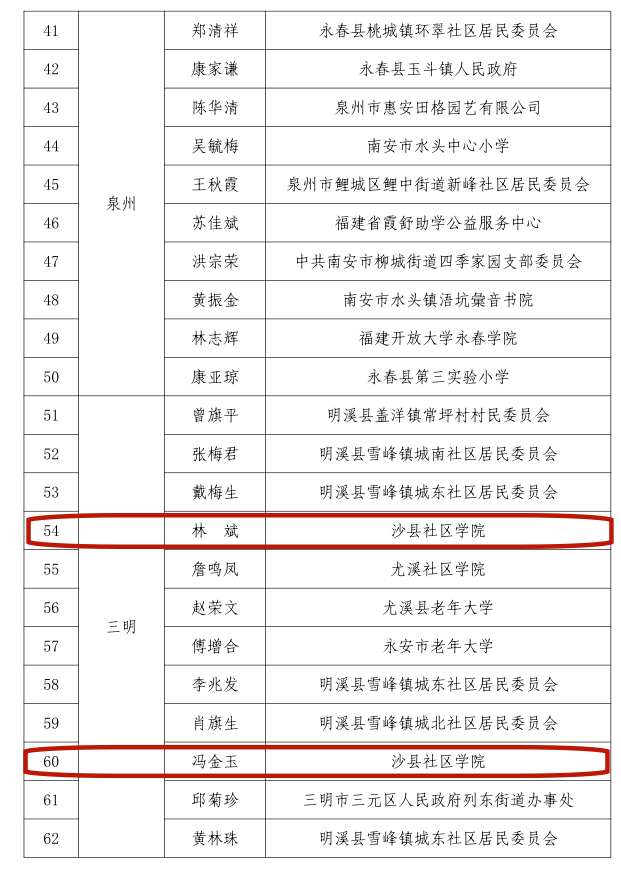 根据福建省终身教育促进委员会《关于做好2024年福建省新时代“百姓学习之星”和“终身学习品牌项目”宣传推介工作的通知》有关要求,经各地各单位申报推荐、专家评审,省级新时代“百姓学习之星”、省级新时代“终身学习品牌项目”名单日前公布,沙县社区学院推荐的林斌、冯金玉入选省级新时代“百姓学习之星”推介名单、长富社区悦享学堂入选省级新时代“终身学习品牌项目”推介名单。