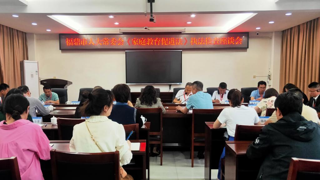 6月5日,福鼎市人大常委会执法检查组就《中华人民共和国家庭教育促进法》和《福建省家庭教育促进条例》(以下简称“一法一条例”)的落实情况莅临福鼎开放大学检查指导工作,并召开座谈会。福鼎市教育督导事务中心副主任陈文翰陪同调研,宁德市家庭教育指导专家代表,有关社区和中小学、幼儿园负责人,及福鼎开放大学班子成员参加座谈会。会议由市人大常委会委员、市人大社会建设委专职副主任委员陈先航主持。