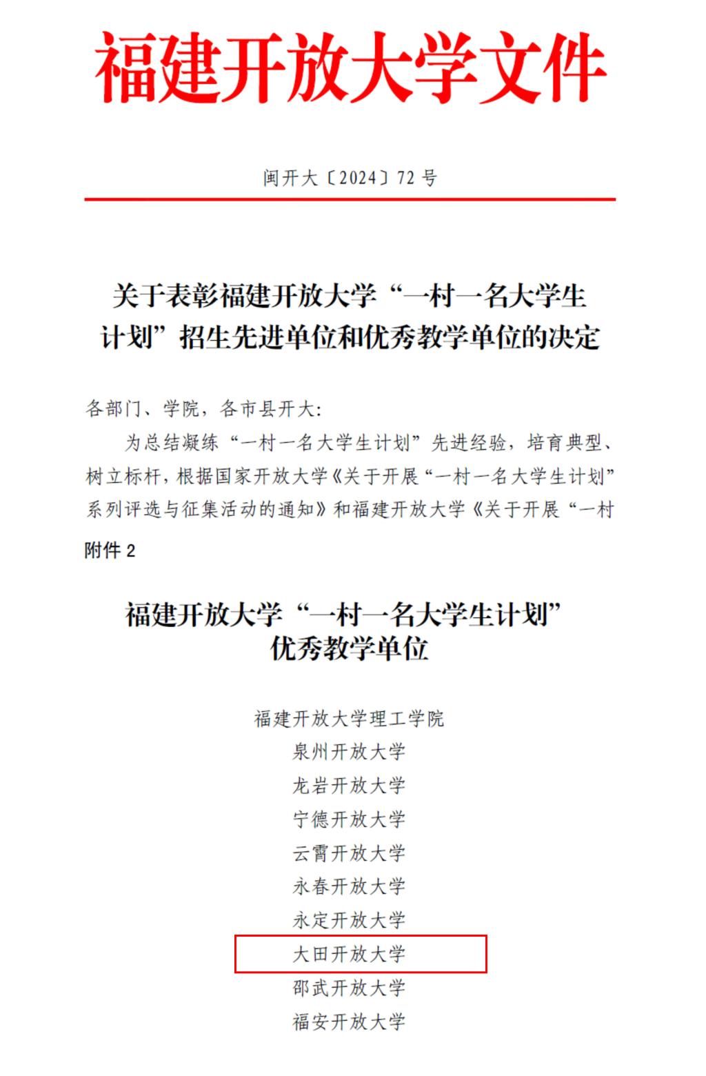 大田开放大学荣获“福建开放大学‘一村一名大学生计划’(简称“一村一”)优秀教学单位”。