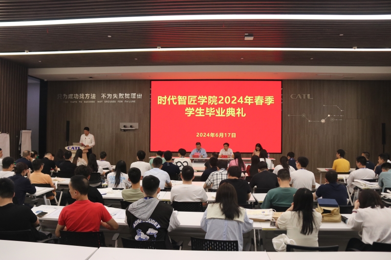 6月17日,时代智匠学院2024年春季学生毕业典礼在宁德时代公司举行。宁德开放大学党委书记、校长叶祖庚,宁德时代工会主席詹书知出席并讲话。典礼由宁德开放大学党委副书记余水淮主持。
