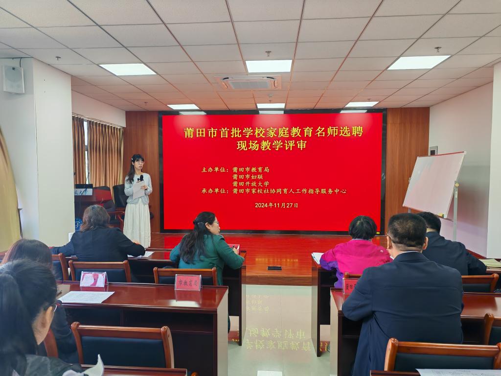 莆田市首批学校家庭教育名师选聘工作于今年10月启动,由莆田市教育局、莆田市妇联、莆田开放大学联合主办,莆田市家校社协同育人工作指导服务中心承办,旨在选拔出一批专业素养高、教学能力强的家庭教育讲师,引领带动全市家庭教育专业师资队伍建设。选聘工作得到了社会各界的广泛关注和积极响应。经过前期的个人申报、单位推荐,并对申报者上报材料进行综合评审后,选定18位综合优势突出的竞聘者进入到本次现场教学评审环节,后续将根据“宁缺毋滥”的原则确定名师入选名单,并组织相关培训、科研和实践活动,充分发挥名师的示范引领作用,推动莆田市校家社协同育人“教联体”建设工作科学化、规范化、专业化开展。