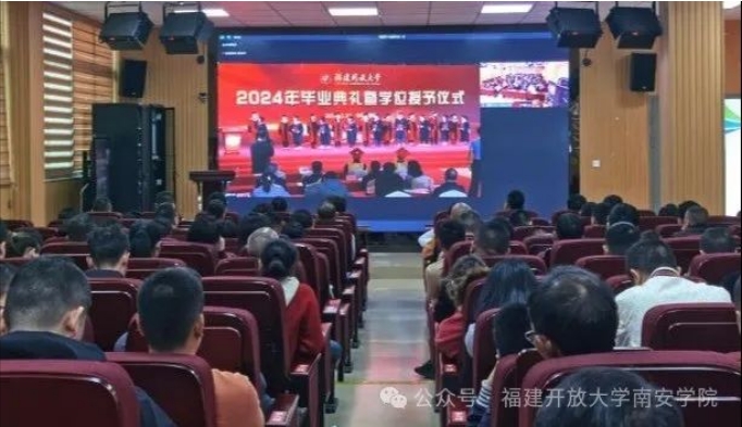 为加强毕业生爱校荣校教育,增强学生责任感、自豪感和归属感,11月30日下午,福建开放大学南安学院举行2024年秋季毕业典礼,庆祝371名毕业生圆满完成学业。南安学院全体教职员工和130名行政管理本、专科(村干班)毕业生在现场参加,其他241位毕业生在线上参加,一同见证这一庄重而温馨的时刻,开启他们人生中这一重要篇章。