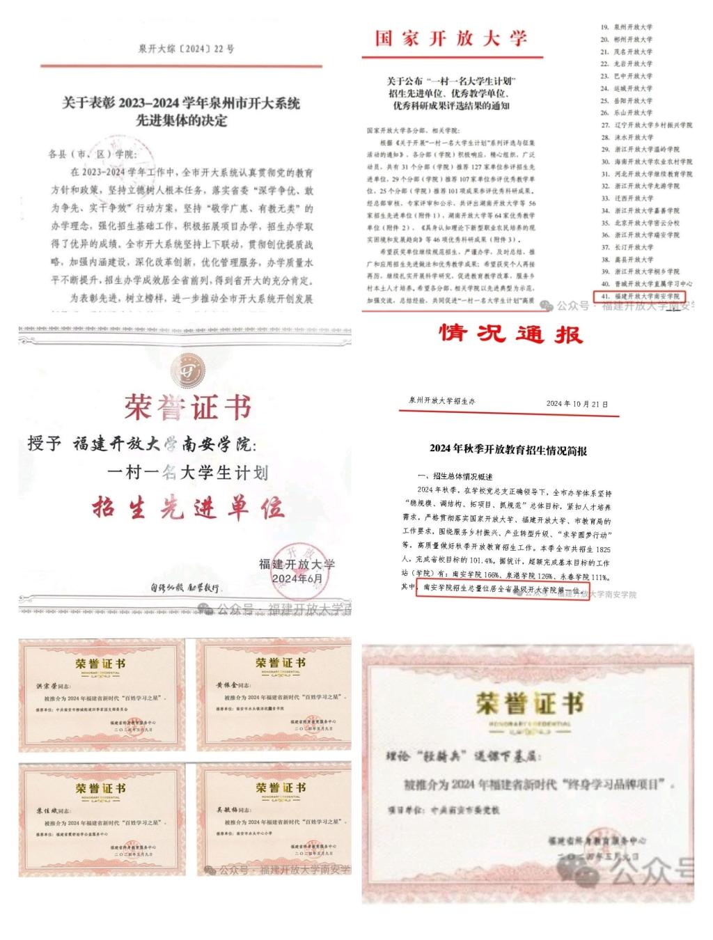 我院荣获教育部一村一名大学生计划招生先进单位,福建开放大学“一村一名大学生计划”招生先进单位,泉州市开大系统先进集体;三个项目获得福建省新时代“终身学习品牌项目”荣誉;四人获得福建省新时代“百姓学习之星”荣誉。荣耀时刻已至,但我们的征程才刚刚开始。让我们以“弦歌不辍”的精神为指引,怀揣着对未来的无限憧憬,携手共进,用我们的智慧和汗水,去谱写更加绚丽多彩的新章。相信在我们的共同努力下,我们一定能够创造出更加辉煌的成就,走向更加灿烂的明天!