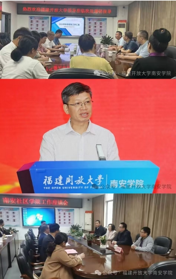 7月18日,福建开放大学党委副书记马成斌到我院参加2024 春村干班毕业典礼;9月9日,福建开放大学副校长李正光到我院开展招生工作专题调研; 12月23日,邱雪亮副市长到我院开展南安社区学院工作座谈会。相信在领导的关怀与指导下,在全体员工的共同努力下,福建开放大学南安学院一定能够在前进的道路上乘风破浪,砥砺前行,不断创造新的辉煌,为南安经济发展添砖加瓦,书写更加绚丽的篇章!