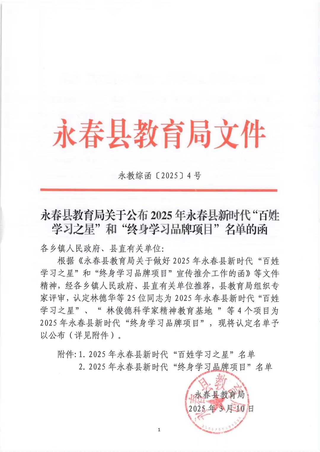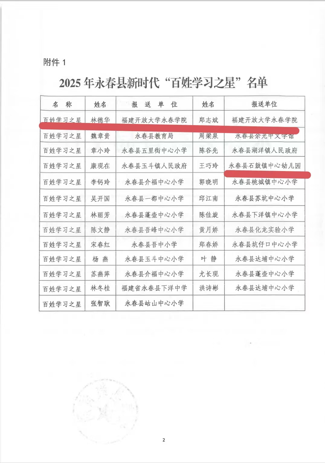 日前,2025年永春县新时代“百姓学习之星”结果揭晓,共25人获此殊荣。福建开放大学永春学院学生林德华、郑志斌和优秀毕业生王巧玲上榜 。