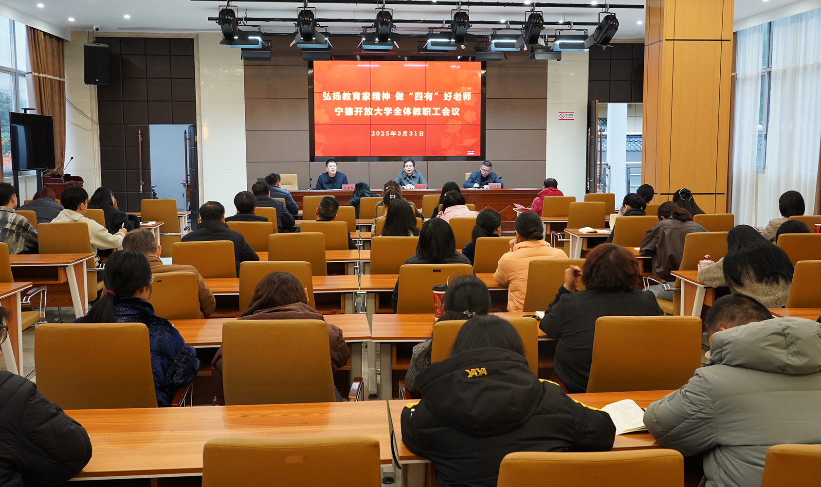 3月31日下午,宁德开放大学以“弘扬教育家精神 做‘四有’好老师”为主题召开全体教职工会议,党委书记、校长叶祖庚,党委委员、副校长王晓飚及全体教职工参加会议,会议由党委副书记、纪委书记余水淮主持。