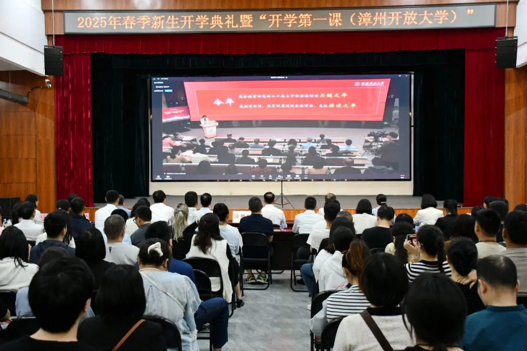 4月12日上午,漳州开放大学组织2025年春季新生在丹霞堂参加全省办学体系双向视频开放教育新生开学典礼暨开学第一课。校党委书记、校长詹志灵,党委委员、副校长吕峰鹏,党委委员、副校长陈毅文,各科室负责人及教师代表出席活动。