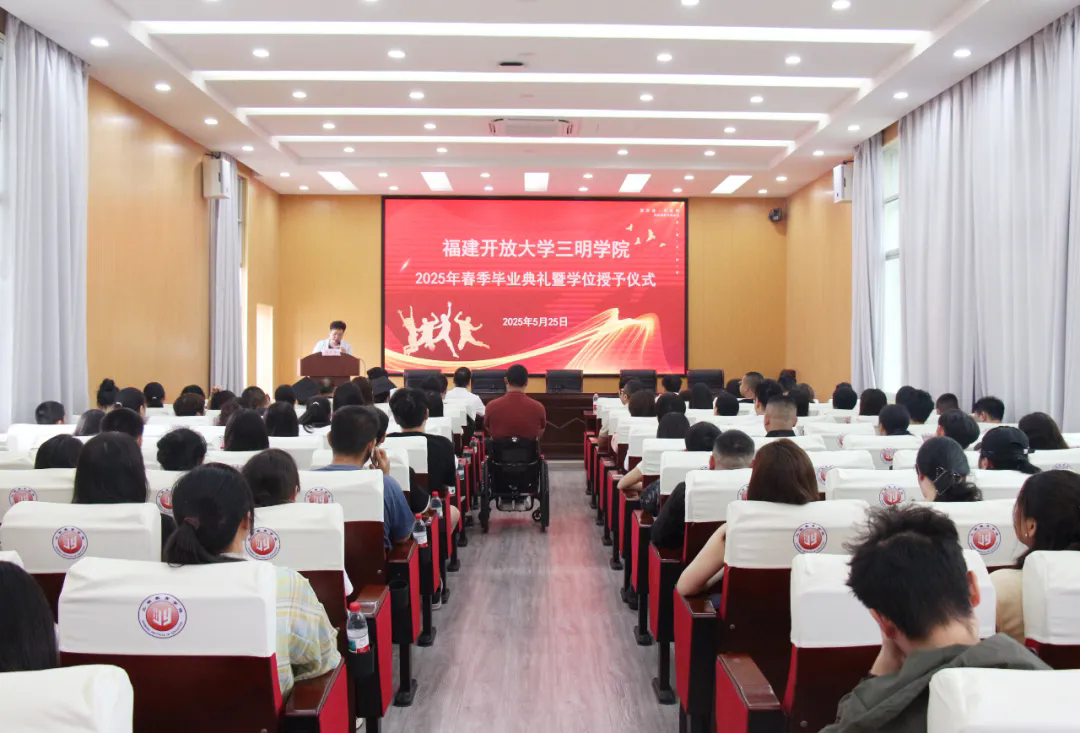毕业骊歌起,青春再启航。为进一步深化“12335”成人大学生思政工作,加强毕业生爱校荣校教育,增强学生责任感、自豪感和归属感,5月25日上午,福建开放大学三明学院举行2025年春季开放教育毕业典礼暨学位授予仪式,全体教职工及2025年毕业生共计130余人参加典礼,院党委副书记、院长林启福出席典礼,典礼由院党委委员、副院长张莲珠主持。