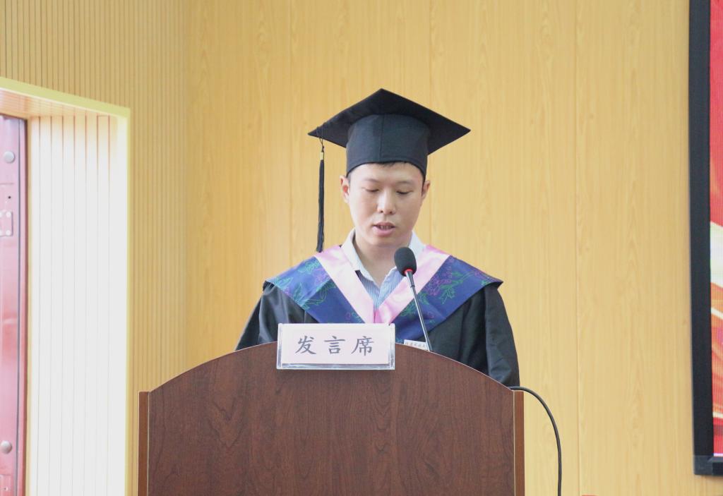2021年春季法学本科班陈翔作为优秀毕业生代表发言。他向学院的领导和老师们致以最诚挚的谢意,并分享了借助在线平台融合理论实践的学习经历,以及首次学位申请失利后不懈努力终获成功并助力公务员考试的历程,呼吁同窗永葆赤子之心、坚持终身学习,为三明革命老区高质量发展贡献力量。