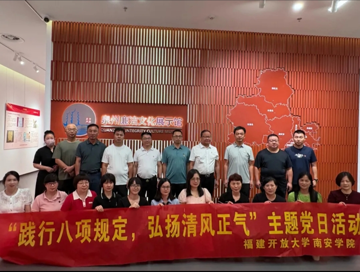 为进一步加强党风廉政建设,深入学习贯彻中央八项规定精神,增强教职工廉洁自律意识,7月29日上午,福建开放大学南安学院组织全体老师前往清廉泉州馆,开展“践行八项规定,弘扬清风正气”主题党日活动。此次活动旨在通过实地参观学习,引导教职工深刻领悟廉洁从教的重要性,以优良作风推动学院各项事业高质量发展。