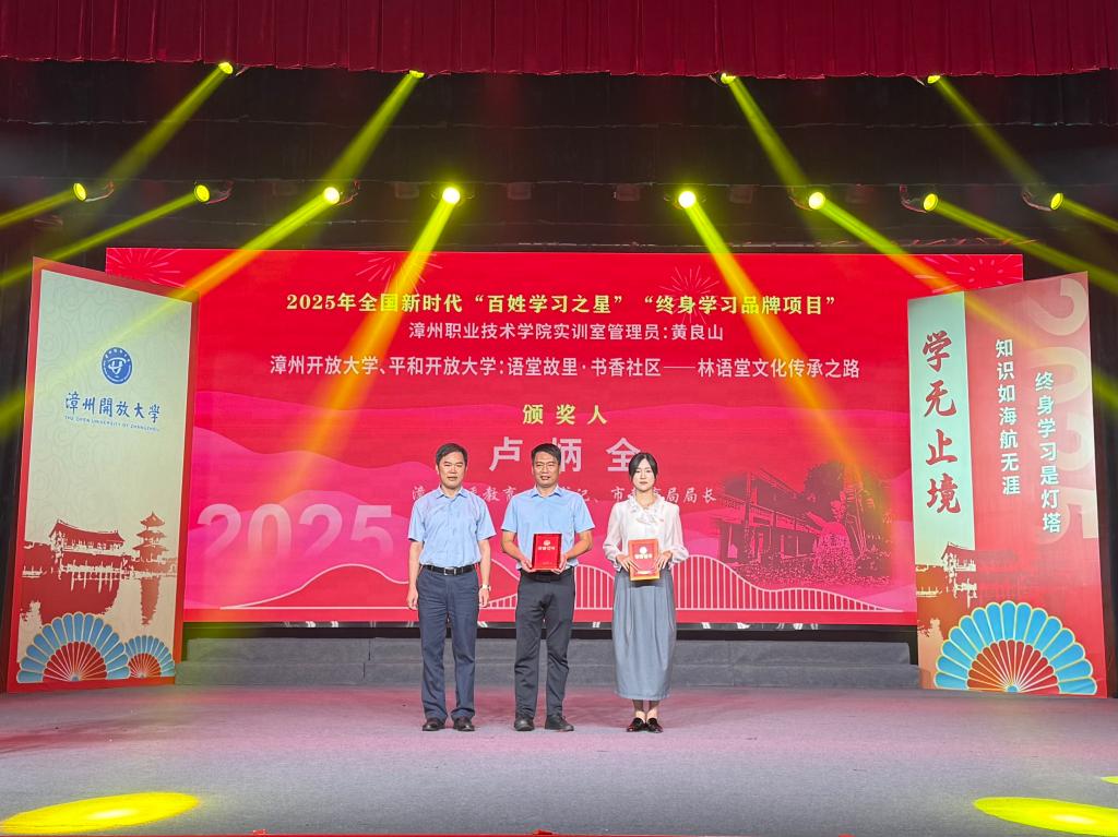 漳州开放大学党委副书记陈汉忠宣读获得2025年全国、福建省“百姓学习之星”“终身学习品牌”荣誉名单。卢炳全、詹志灵等7位领导为获奖的单位和个人颁发证书。全国新时代“百姓学习之星”漳州职业技术学院黄良山和“终身学习品牌项目”《语堂故里·书香社区——林语堂文化传承之路》代表漳州开放大学余础础分别作典型发言。