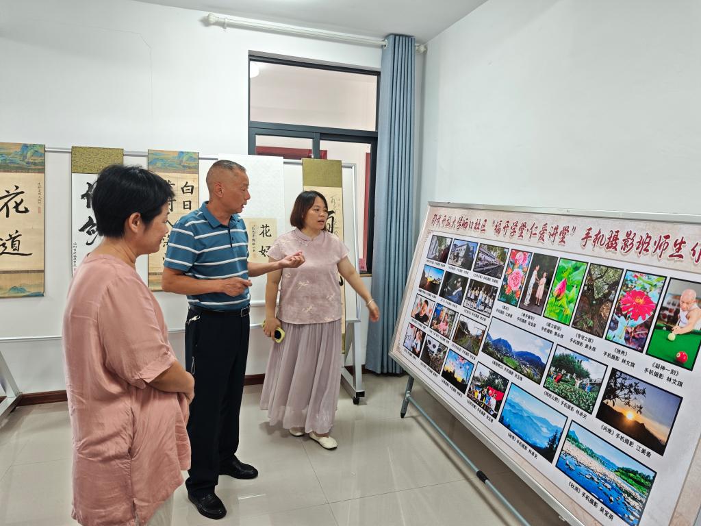 黄香喜一行在晒口街道晒口社区居委会党支部书记吴美玲的陪同下,实地察看了社区办公环境,参观了社区“福开学堂”学员学习活动剪影和书法、手机摄影作品展览。