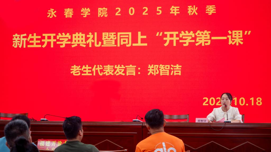 吕朝晖向新同学介绍学院办学历程,分享近年办学亮眼成绩,并对新生提出三点殷切希望:一要胸怀家国、勇担责任,将个人成长融入国家发展与民族振兴洪流,锚定时代使命;二要勤学善思、锤炼本领,珍惜在学院时光,深耕专业,以扎实学识练就过硬能力,筑牢服务社会的根基;三要爱院如家、共促发展,用心守护学院形象,主动讲好学院故事,明晰个人成长与学院发展同频共振的紧密联系。他表示,学院将全力搭建优质学习平台,与新生携手奋进。他祝愿大家学有所成、为学院增光,期待众人积极宣传学院,助力提升知名度和影响力。同时勉励新生:“人生之路漫长,学习永无止境。愿大家在永春学院拼搏圆梦,未来能骄傲地说,选择永春学院,是从未后悔的决定,并以所学为中国式现代化永春实践添砖加瓦!”
