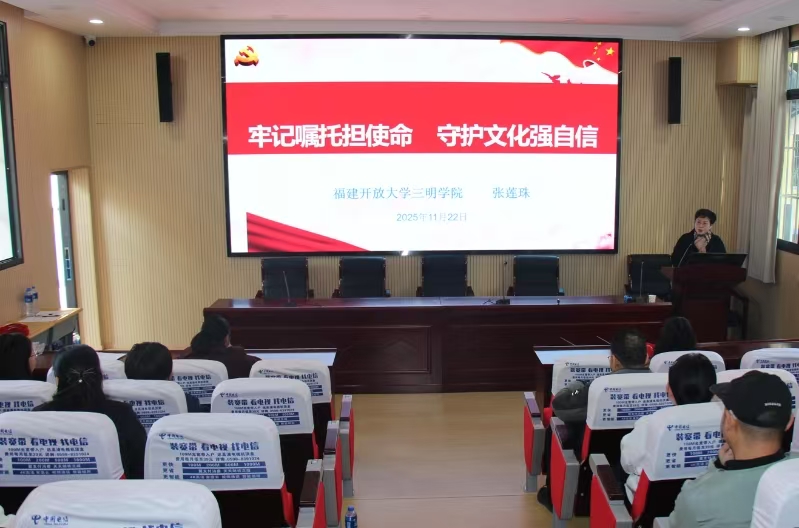 活动开始福建开放大学三明学院副院长张莲珠以“牢记嘱托担使命 守护文化强自信”为题讲授思政课,将万寿岩保护实践与开放教育育人目标深度融合。课上回顾2000年时任福建省省长的习近平同志两次批示保护万寿岩旧石器时代洞穴遗址,推动其从濒危走向国家考古遗址公园、国家二级博物馆,成为文化遗产保护典范。张莲珠结合开放教育面向大众、注重实践的特点,号召开大学子以万寿岩保护精神为指引,深耕文化遗产知识,将守护使命融入学与行,为三明文化保护发展贡献开放教育力量。