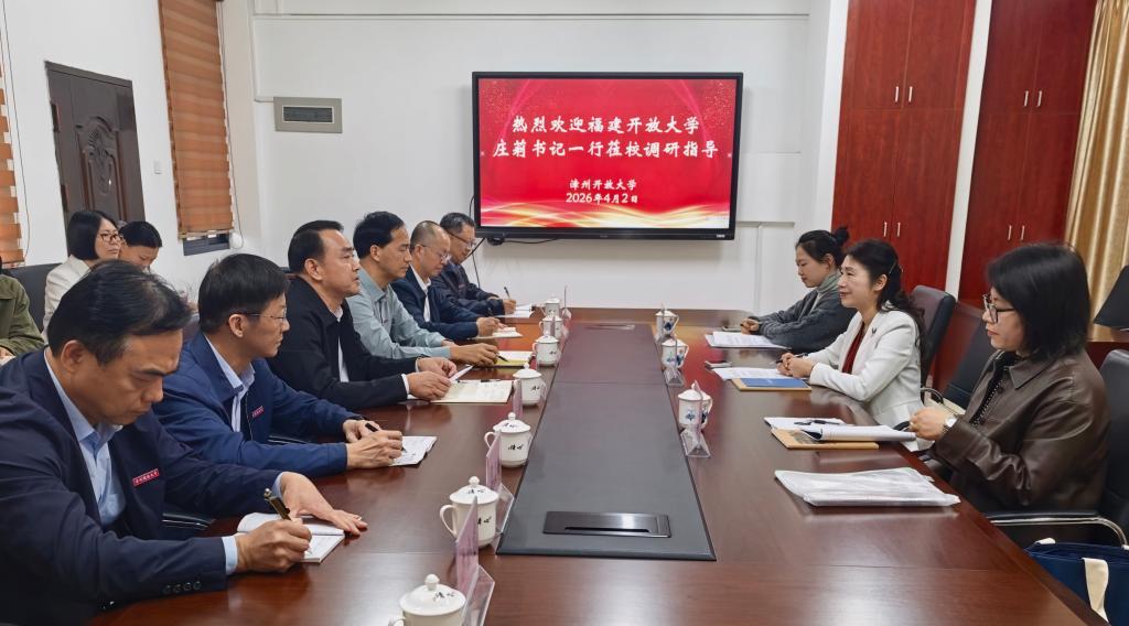 4月2日,福建开放大学党委书记庄莉一行调研指导漳州开放大学招生办学工作,并就推进2026年春季招生,扎实开展树立和践行正确政绩观学习教育,结合“十五五”规划编制工作召开座谈会。