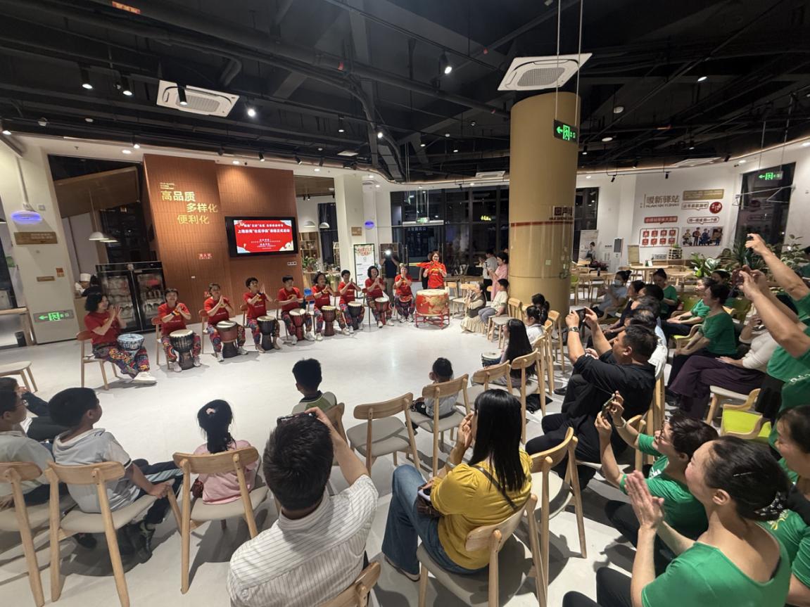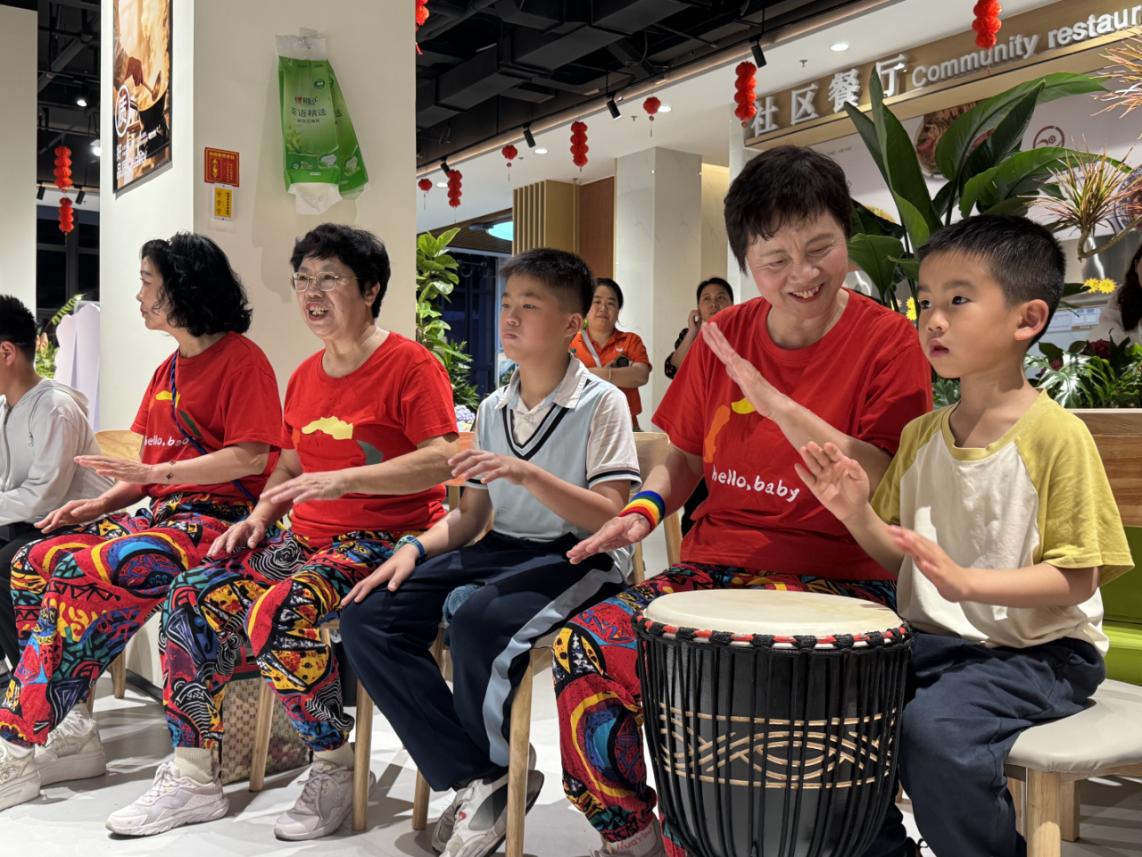 非洲鼓教师陆承旺讲解着基本技巧,漳州开放大学学员代表及社区居民围坐一圈,跟随节拍演奏。非洲鼓课程后是老年健身操课,漳州市舞蹈家协会副主席张缤及其团队表演银龄舒缓康养操,其动作舒缓柔和、难度适中,照顾到老年人身体特点,传递着社区“银龄乐享”的建设理念。