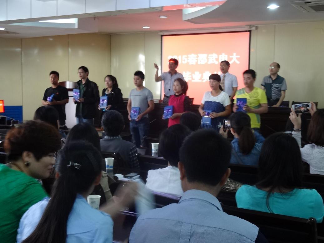 教务处主任张建良宣读了2015届春季毕业生名单。校领导为各班毕业生代表发放毕业证书,并与他们合影。