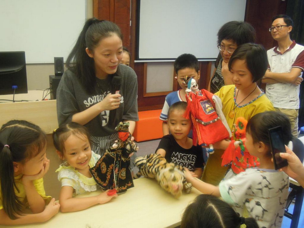 木偶表演艺术家与小朋友一起做“手指活动操”与木偶表演
