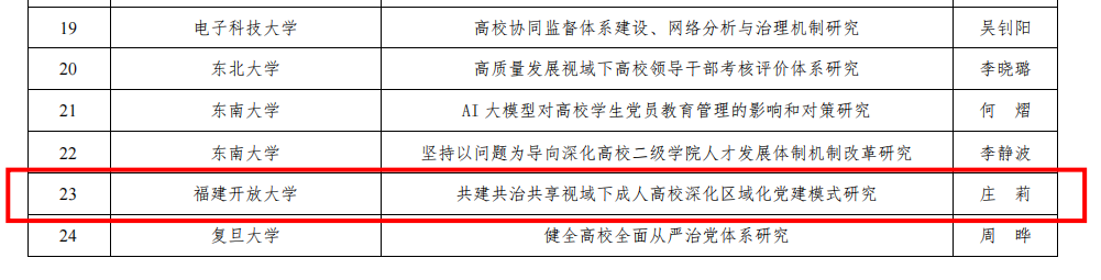 近日,全国党的建设研究会高校党建研究专业委员会公布了2024年课题立项结果,我校党委书记庄莉主持申报的《共建共治共享视域下成人高校深化区域化党建模式研究》获一般项目立项。