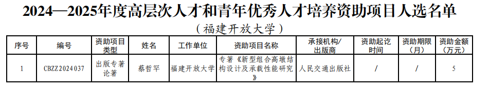 近日,福建省人力资源和社会保障厅发布了《福建省人力资源和社会保障厅关于公布2024—2025年度高层次人才和青年优秀人才培养资助项目人选名单的通知》,我校引进博士、土木工程本科专业主任蔡哲罕老师专著《新型组合高墩结构设计及承载性能研究》获项目资助,资助金额五万元。